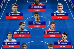 后衛(wèi):卡雷拉斯(皇馬,5000萬歐)、莫斯克拉(阿森納,3500萬歐)、阿森西奧(皇馬,3000萬歐)、普比爾(馬競(jìng),1600萬歐)