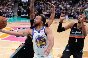 文班到三分線去追庫(kù)里,被庫(kù)里直穿籃下造罰球;瓦塞爾繞掩護(hù)細(xì)節(jié)不好,被庫(kù)里要到三罰球:半節(jié)庫(kù)里三個(gè)三分9個(gè)罰球,內(nèi)外開(kāi)花,馬刺防守崩壞: