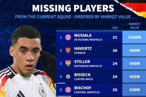 德國落選本期國家隊球員身價榜:穆西亞拉1.4億歐居首 哈弗茨第二
