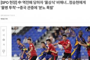 “被水瓶擊中的鄭升炫憤怒地向中國球迷提出抗議,正在熱身的李清龍上前制止避免沖突升級,但這一幕足以展現中國球迷的不文明?!?/p>