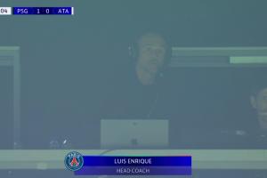 比賽第23分鐘,轉(zhuǎn)播鏡頭給到巴黎主帥恩里克,他出現(xiàn)在看臺(tái)上,頭戴耳機(jī)指揮著球隊(duì)。
