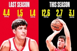 謝潑德本賽季場均12.6分2.7籃板3.1助攻1.6搶斷,三項命中率49.1/47.8/66.7%;