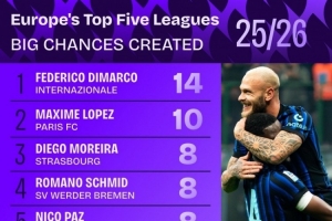 本賽季五大聯(lián)賽創(chuàng)造重大機(jī)會排名: