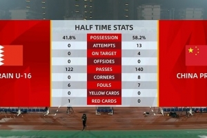 體育資訊11月22日訊 U17亞預(yù)賽第一輪,國(guó)少隊(duì)半場(chǎng)3-0領(lǐng)先巴林隊(duì),數(shù)據(jù)方面,國(guó)少隊(duì)半場(chǎng)13射4正3進(jìn)球,對(duì)手0射門。