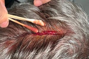 國安翻譯賽后曬出塞蒂恩傷口,他的頭頂被劃出一道大口子。