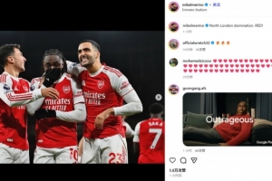 他也在賽后通過社媒曬出自己和隊友的相擁慶祝照,并配文:“紅色統(tǒng)治北倫敦!”