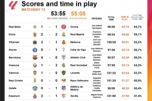 體育資訊11月25日訊 Opta統(tǒng)計(jì)了西甲第13輪比賽的凈比賽時(shí)間,本輪場(chǎng)均凈比賽時(shí)間為53分鐘55秒,而本賽季西甲場(chǎng)均凈比賽時(shí)間為55分鐘8秒。
