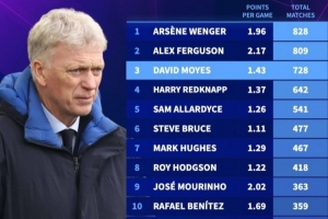 體育資訊11月26日訊 德國(guó)轉(zhuǎn)會(huì)市場(chǎng)統(tǒng)計(jì)了英超主帥執(zhí)教場(chǎng)次排名,莫耶斯728場(chǎng)排名第三,有望追趕弗格森和溫格。