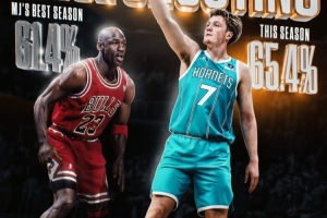 本賽季黃蜂4號秀克尼佩爾場均19.4分5.8籃板2.9助攻,三項(xiàng)命中率49.1、43.8、90%,真實(shí)命中率65.4%;喬丹生涯最佳單賽季真實(shí)命中率是61.4%。