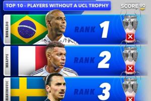 外媒Score90列無歐冠球員TOP10: