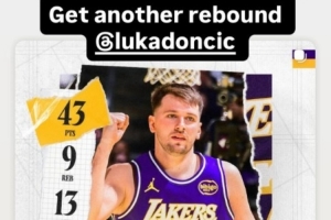 賽后湖人球員拉拉維亞曬出東契奇的數(shù)據(jù)海報,他調(diào)侃道:“你多搶個籃板啊。”