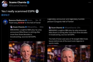 體育資訊9月19日訊 今日,名記Shams的戲仿賬號(hào)Scams Charina在推特上進(jìn)行“日常工作”(即發(fā)布假消息),稱ESPN的名人堂解說(shuō)員邁克-布林將退休。