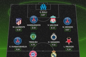 后衛(wèi):略倫特(馬競(jìng),8.30分)、馬爾基尼奧斯(巴黎,8.50分)、范迪克(利物浦,8.13分)、努諾-門(mén)德斯(巴黎,8.87分)