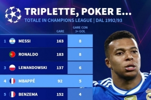 體育資訊11月27日訊 德國轉(zhuǎn)會市場統(tǒng)計了1992-1993賽季歐冠改制以來球員單場進球3+的場次,并列出榜單,梅西、C羅8場居首,萊萬6場、姆巴佩5場。