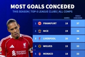 本賽季五大聯(lián)賽球隊(duì)失球榜:法蘭克福37球最多,利物浦34球第三