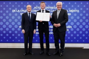 在伯納烏榮譽(yù)包廂舉行的儀式上,克羅斯被授予德國(guó)功績(jī)勛章騎士十字勛章。德國(guó)總統(tǒng)施泰因邁爾親自為這位皇馬傳奇和世界足壇巨星頒發(fā)了這一榮譽(yù)。出席授勛儀式的還有皇馬名譽(yù)主席何塞·馬丁內(nèi)斯·皮里、機(jī)構(gòu)關(guān)系總監(jiān)布特拉格諾、主帥阿隆索、球員巴爾韋德、呂迪格,以及皇馬傳奇球員羅伯托·卡洛斯、阿韋羅亞和索拉里。