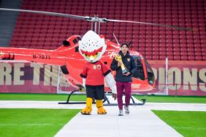 激動人心的奪冠視頻過后,大家的目光被靜候在內場的臨港捷運紀念版直升機吸引,儀式開始前,這架直升機載著王燊超和獎杯從川沙飛抵球場。這一環(huán)節(jié)不僅是榮耀的展示,更是俱樂部積極探索“低空+足球”體旅融合新范式的生動實踐。隨后,王燊超與俱樂部總經(jīng)理沙良昌共同將新賽季冠軍獎杯安放于柱頂,與三座往屆火神杯組成“冠軍獎杯矩陣”,將現(xiàn)場氛圍推向高潮。