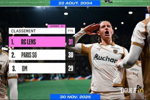 體育資訊12月1日訊 法甲第14輪,朗斯客場(chǎng)2-1擊敗昂熱,14輪過后10勝1平3負(fù)31分位列法甲積分榜首位。