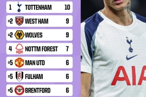 體育資訊12月1日訊 在本輪英超,熱刺主場1-2不敵富勒姆。OPTA盤點(diǎn)了2025年英超主場失利場次榜,具體如下:
