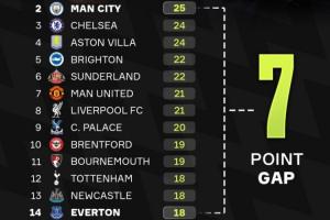 體育資訊12月02日訊 本賽季英超已經(jīng)進(jìn)行了13輪,賽季已過(guò)三分之一,積分榜上的競(jìng)爭(zhēng)依舊非常激烈,第2名曼城與第14名埃弗頓之間的差距只有7分。