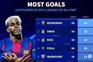 五大聯(lián)賽歷史U19進(jìn)球榜: