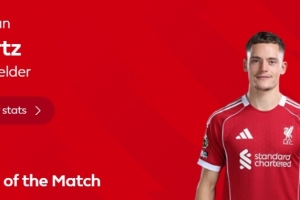 此役維爾茨踢滿全場,并造穆基勒烏龍,為利物浦扳平比分,英超官方宣布,經(jīng)過球迷的投票,維爾茨當(dāng)選本場比賽最佳球員。
