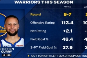 轉(zhuǎn)播方給出一組數(shù)據(jù),本賽季庫里在場時勇士9勝7負(fù),進(jìn)攻效率113.4,凈效率+2.1,投籃命中率46.4%,三分命中率37.9%;
