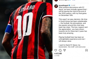 體育資訊12月5日訊 今日,首爾FC官方宣布林加德將在賽季結束后離隊,隨后林加德也在社媒發(fā)文,告別首爾FC。
