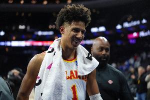 杰倫·約翰遜在上半場還剩1分22秒時(shí)達(dá)成三雙,僅上場16分44秒,用時(shí)歷史第二短。