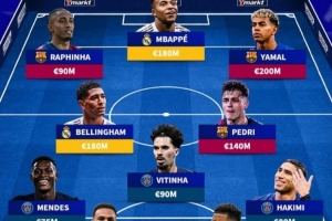 前鋒:拉菲尼亞(巴薩,9000萬)、姆巴佩(皇馬,1.8億)、亞馬爾(巴薩,2億)