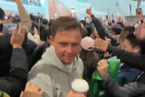 今日國安隊搭乘航班返回北京,眾多國安球迷前來接機,現(xiàn)場還唱響了國安隊歌《國安永遠爭第一》。