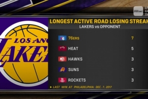 賽前湖人轉(zhuǎn)播商曬出一組數(shù)據(jù),列舉湖人目前面對(duì)不同對(duì)手的最長(zhǎng)客場(chǎng)連敗紀(jì)錄: