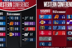 去年今天,聯(lián)盟排名如上圖,當(dāng)時(shí)獨(dú)行俠西部第二,勇士第五,快船第六,湖人12勝11負(fù)第十。