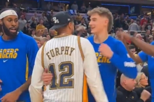 這場(chǎng)比賽,養(yǎng)傷中的哈利伯頓來(lái)到場(chǎng)邊觀賽,他身穿隊(duì)友弗菲的球衣以示支持,并與弗菲本人互動(dòng)。