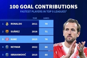 體育資訊12月9日訊 德國轉(zhuǎn)會市場統(tǒng)計了本世紀(jì)五大聯(lián)賽球員在單一聯(lián)賽參與100球所用的場次,并列出最快達成100球排名,C羅居首,蘇亞雷斯、凱恩二三位。