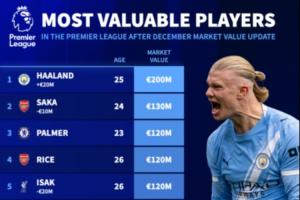 體育資訊12月09日訊 今日德轉(zhuǎn)更新新一期英超球員身價,哈蘭德2億居首,伊薩克降至1.2億,維爾茨降至1.1億。