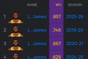 本賽季詹姆斯出戰(zhàn)時6勝1負,86.7%的勝率暫列湖人單賽季生涯新高。