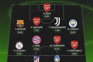 體育資訊12月11日訊 WhoScored根據球員的評分列出了歐冠第6輪最佳陣容,馬丁內利、卡爾、孔德、拉亞在列,阿森納4名球員入選。