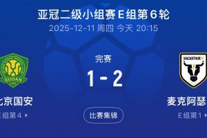 體育資訊12月11日訊 亞冠二級(jí)小組賽E組第6輪,北京國(guó)安1-2輸給麥克阿瑟FC。本輪中超球隊(duì)亞冠賽場(chǎng)表現(xiàn),海港、蓉城戰(zhàn)平,國(guó)安、申花失利。