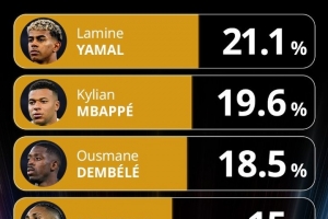 體育資訊12月12日訊 環(huán)球足球獎公布了年度最佳前鋒的投票情況,亞馬爾21.1%領(lǐng)跑。
