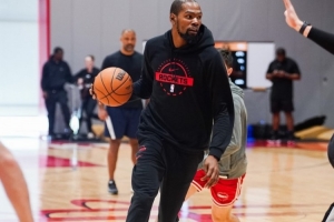 火箭官方發(fā)布了球隊訓(xùn)練照,全員狀態(tài)輕松,杜蘭特眼神專注。