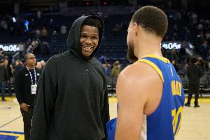 賽后,庫(kù)里和愛德華茲在場(chǎng)邊寒暄。