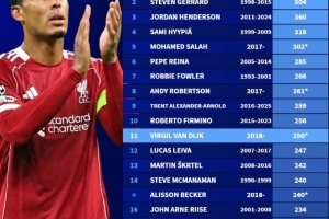 利物浦隊史英超出場榜:范戴克250場第11,阿諾德259場第9