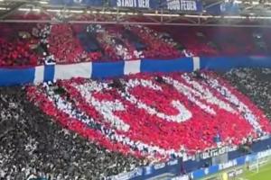 賽前沙爾克04球迷為歡迎來訪的紐倫堡,完成了一次精美的TIFO變換,1秒鐘由沙爾克04隊(duì)徽變成紐倫堡隊(duì)徽。