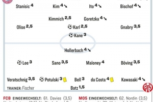 體育資訊12月15日訊 德甲第14輪比賽,拜仁主場(chǎng)2-2戰(zhàn)平美因茨,德國(guó)媒體《踢球者》對(duì)兩隊(duì)球員進(jìn)行了評(píng)分,奧利塞、基米希、卡爾2.5分拜仁隊(duì)內(nèi)最高。