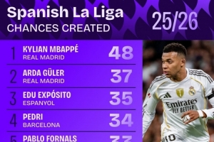 體育資訊12月16日訊 Squawka統(tǒng)計(jì)了球員本賽季在西甲創(chuàng)造機(jī)會(huì)的次數(shù),并列出榜單,姆巴佩48次居首,居萊爾37次第二。