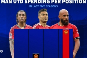 體育資訊12月16日訊 德轉(zhuǎn)盤點(diǎn)了近5個(gè)賽季曼聯(lián)在各個(gè)位置引援花費(fèi)情況,其中鋒線引援花費(fèi)明顯最多,具體如下: