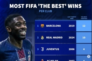 體育資訊12月17日訊 FIFA年度頒獎典禮結(jié)束,登貝萊獲FIFA年度最佳球員,德轉(zhuǎn)列各俱樂部球員獲FIFA年度最佳球員次數(shù),巴薩12次居首,皇馬10次第二,尤文、米蘭、國米、巴黎4次并列第三。