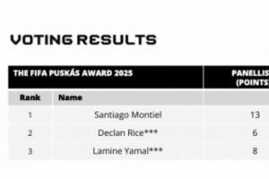 根據(jù)國際足聯(lián)官方公布的票數(shù)統(tǒng)計結果,蒙鐵爾以21分位列第一,賴斯和亞馬爾同積17分分列二三,官方僅給出了前三名的投票結果。
