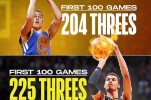 體育資訊9月22日訊 美媒Clutch Points曬出一張文班、庫里還有克萊的生涯前100場比賽三分球的命中總數圖。其中庫里生涯前100場進了200個三分,而克萊是204個,而文班作為內線投中了225個。